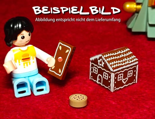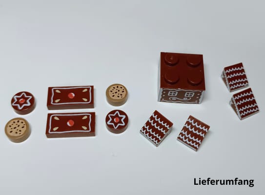 Es weihnachtet sehr mit diesem Lebkuchenhaus im Klemmbausteinformat! Das Haus wird aus einem rundum bedruckten 2×2-Stein und vier bedruckten 1×1-Käseecken zusammengesetzt. Darüber hinaus enthält das Set zwei Lebkuchen im Format 1×2, sowie zwei Stern-Kekse und zwei Cookies im 1×1-Rund-Format.